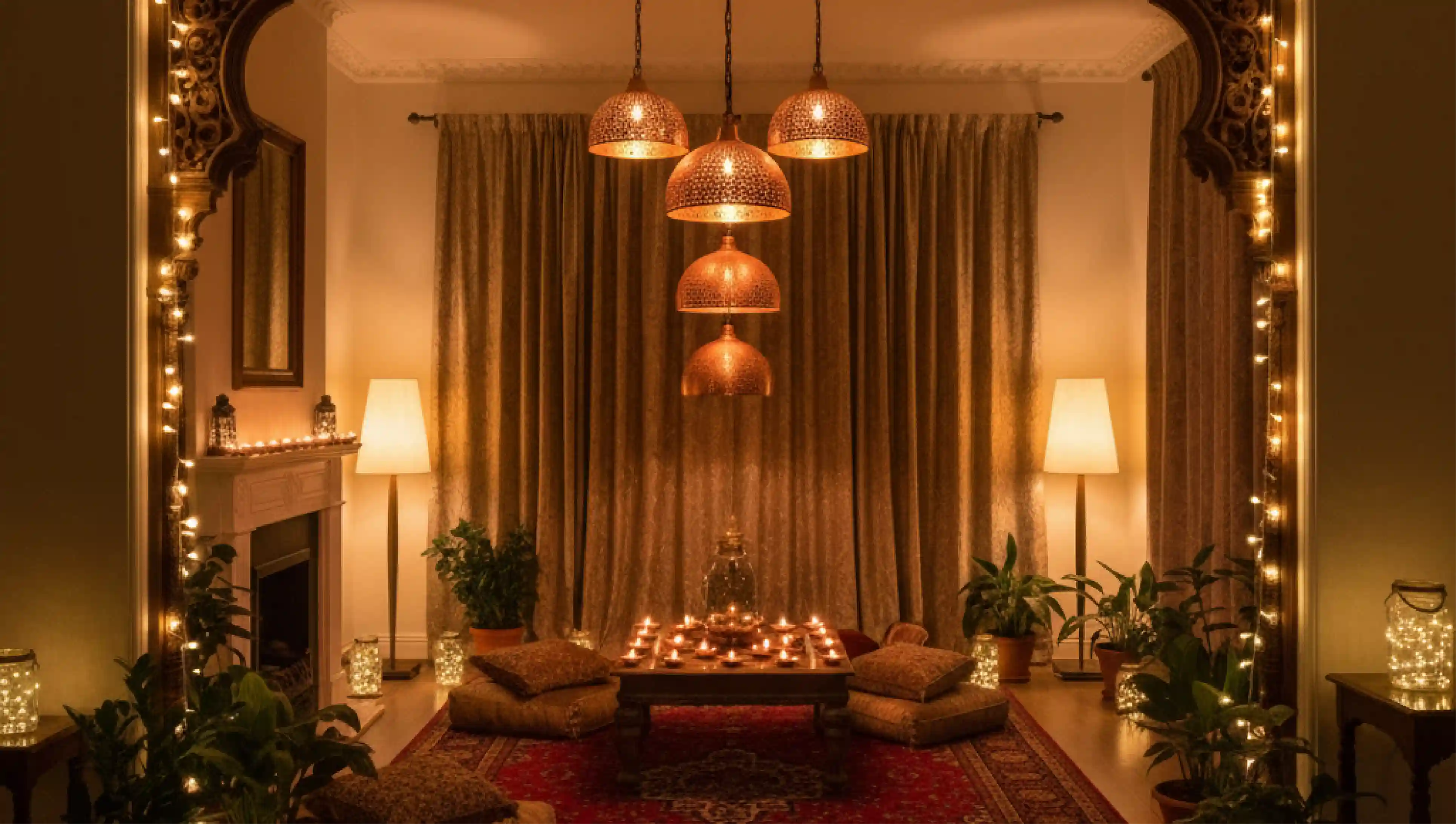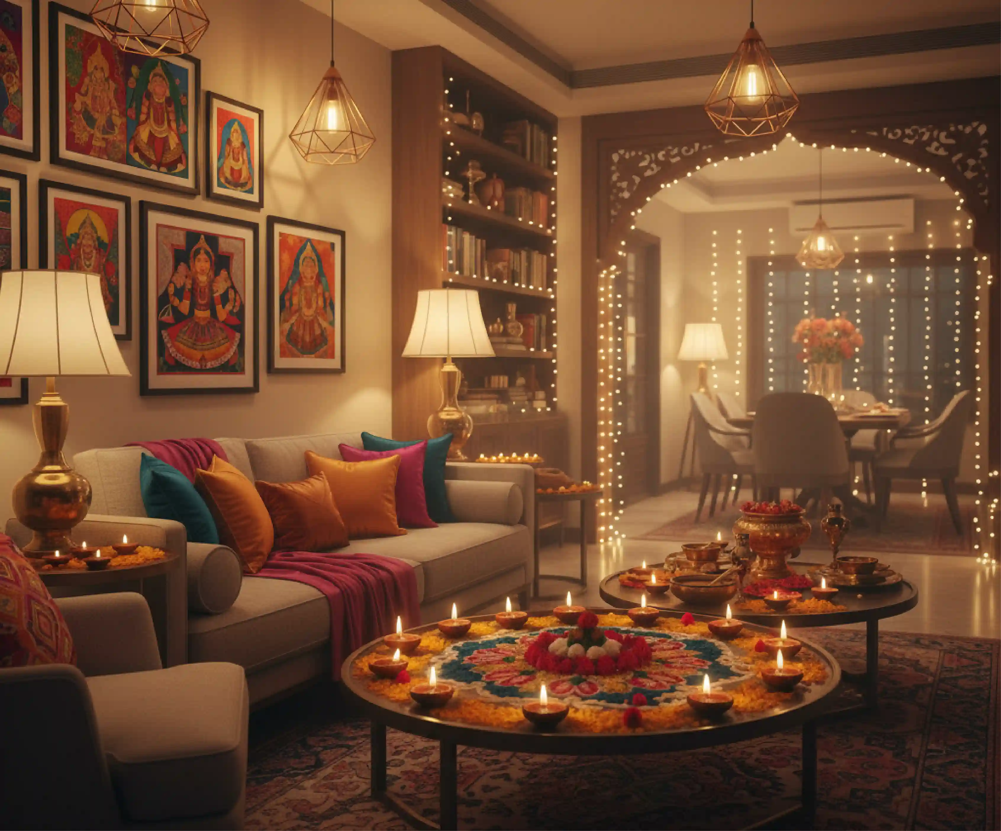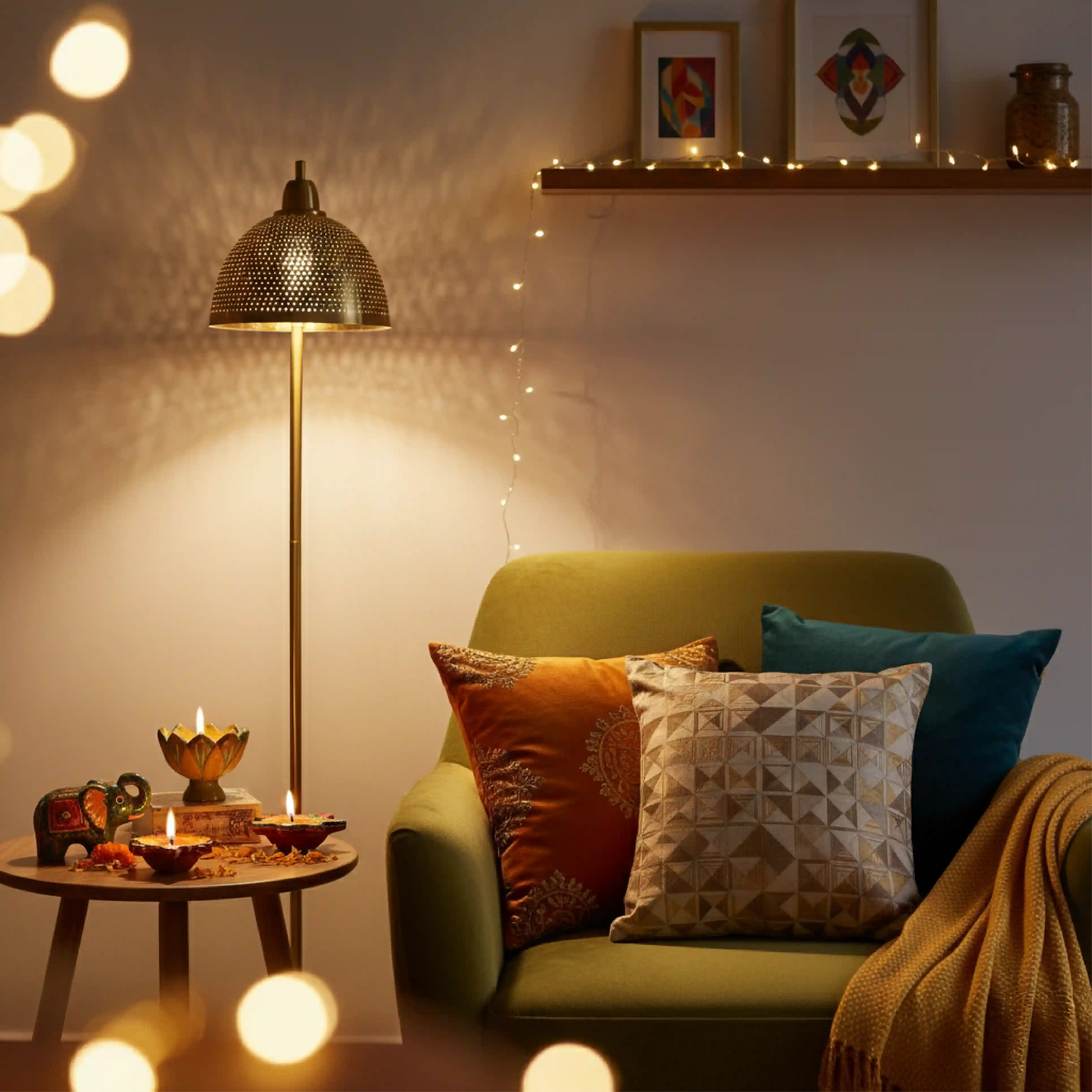 Forget one row of diyas. Think layered warmth: soft floor lamps, glowing pendant lights, and fairy lights tucked into unexpected corners. Lighting isn’t just practical - it’s mood-making. The right glow can turn a simple living room into a welcoming festival haven.
