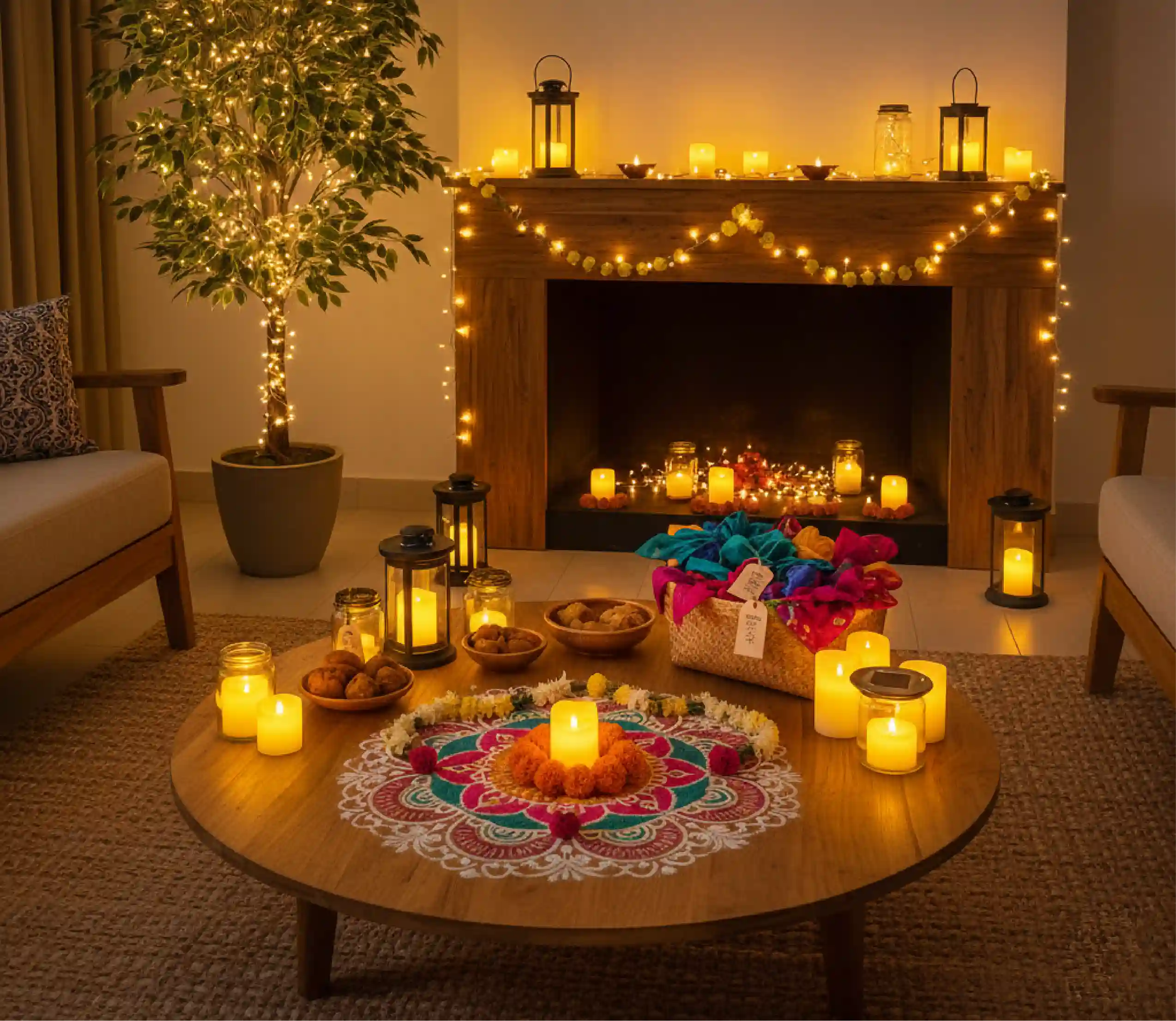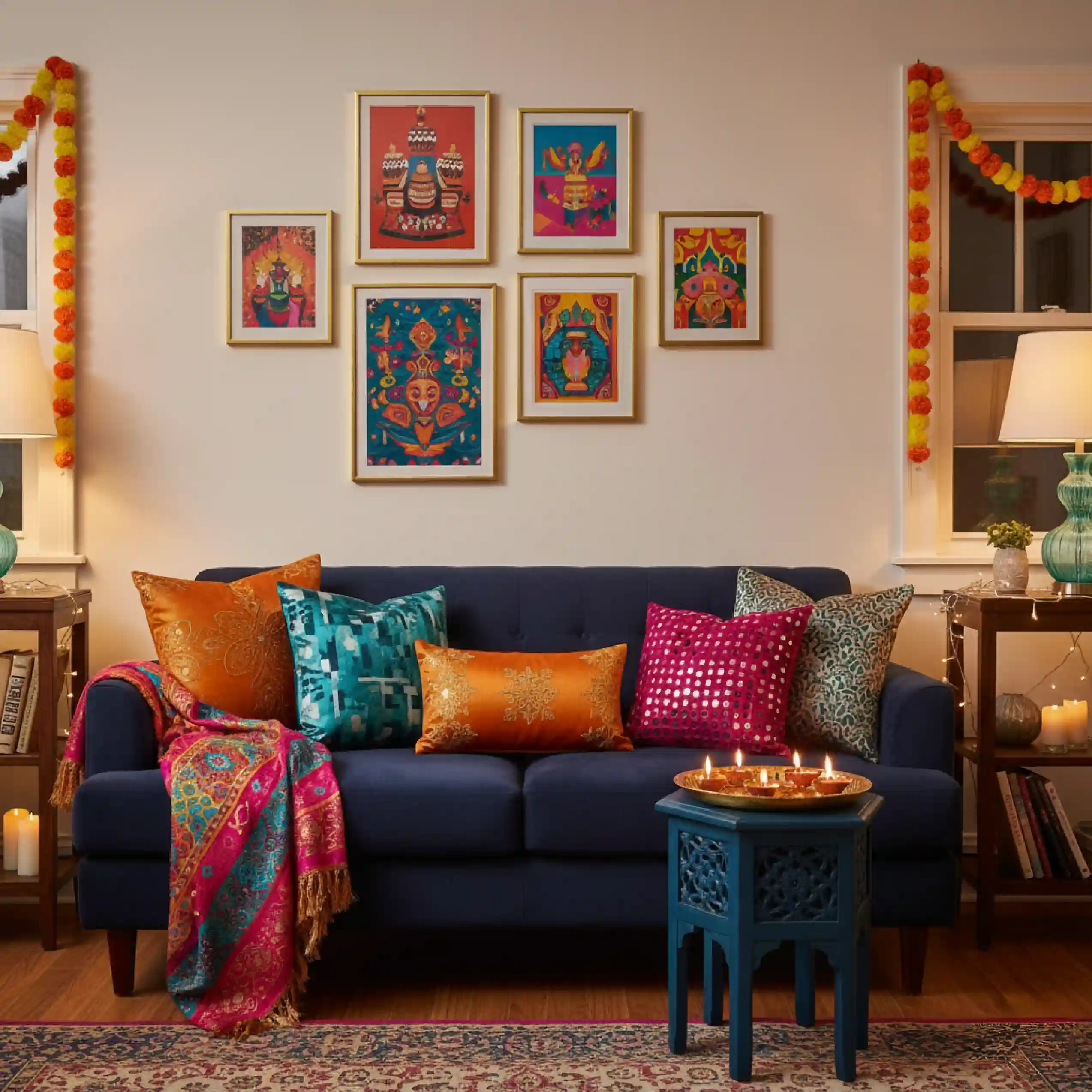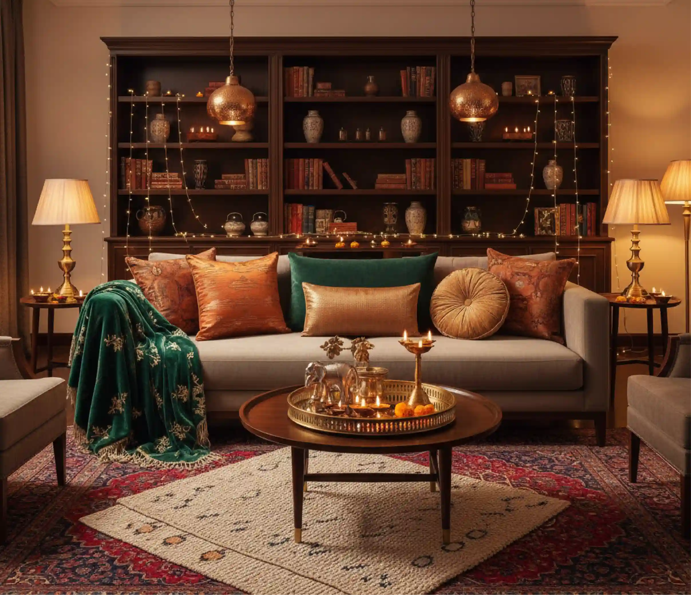 Forget one row of diyas. Think layered warmth: soft floor lamps, glowing pendant lights, and fairy lights tucked into unexpected corners. Lighting isn’t just practical - it’s mood-making. The right glow can turn a simple living room into a welcoming festival haven.