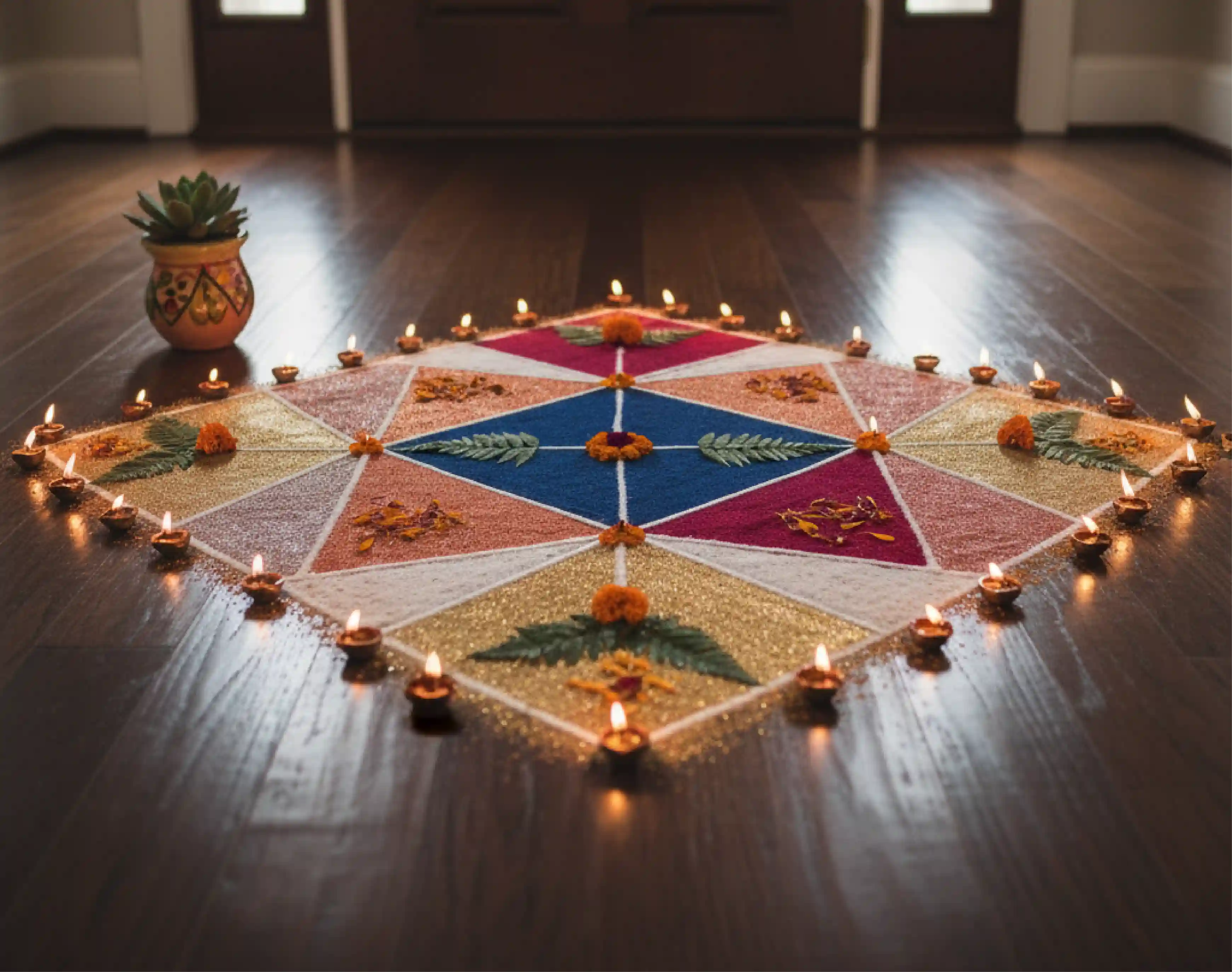 Traditional patterns are timeless, but there’s no harm in a modern twist. Try metallic powders, pressed flowers, or even painted geometric designs. Even a small, quirky rangoli at the doorway can make a big impact and hint at the style inside.