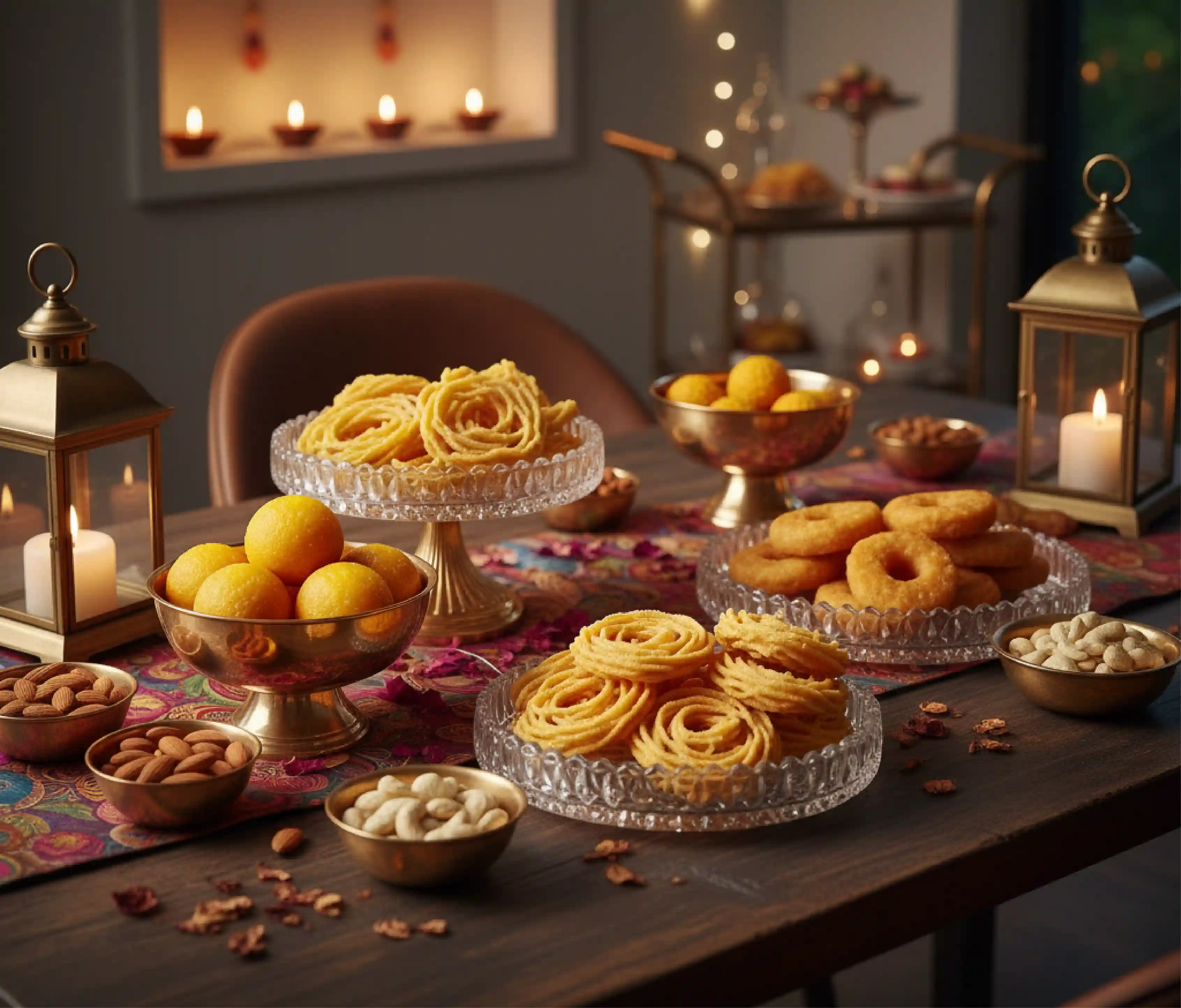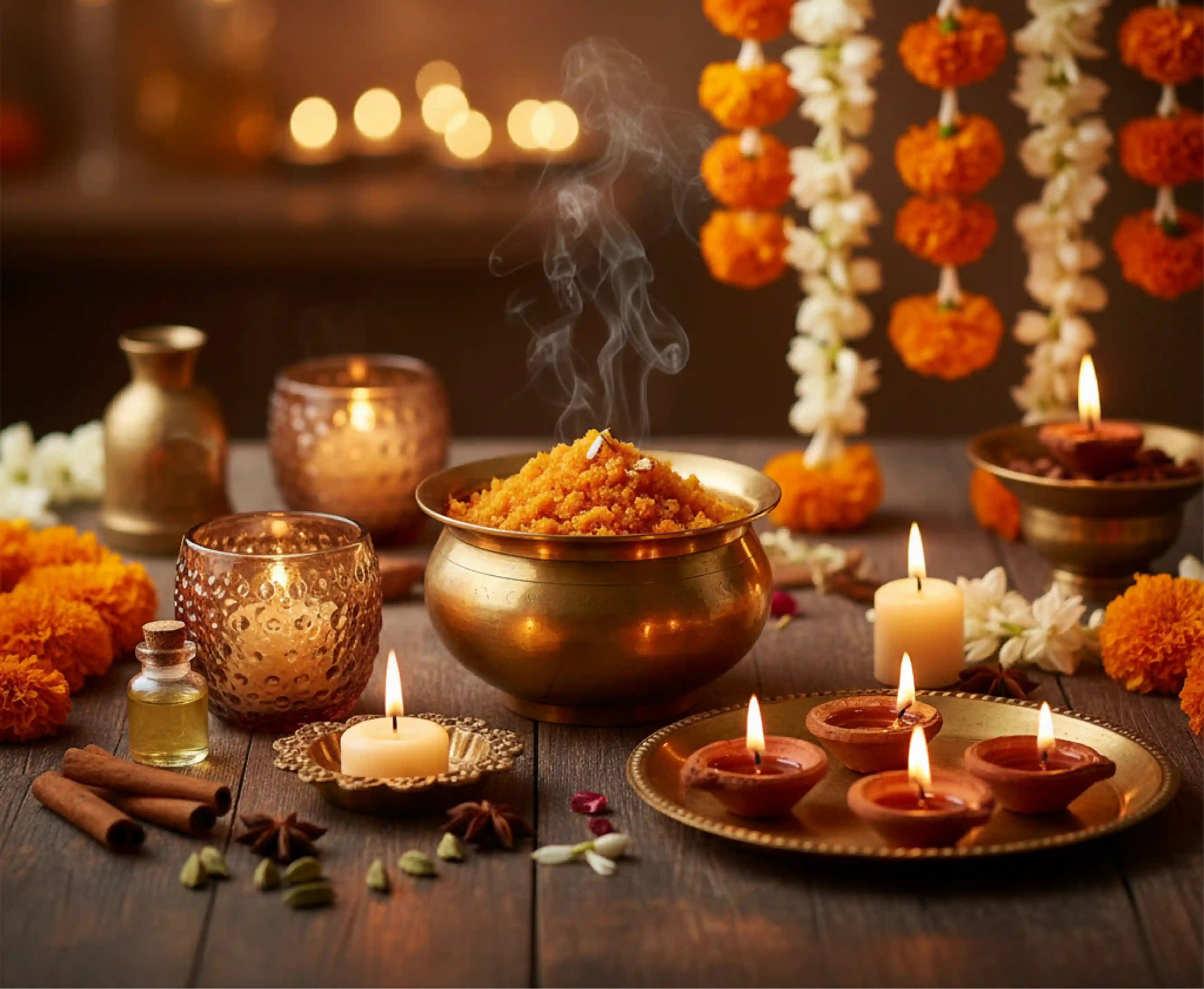 Diwali smells are unforgettable. Light scented candles, simmer a ghee-based dessert, or bring in fresh flower garlands. A festive aroma instantly makes your space feel alive and welcoming, and sets the tone for the celebrations to come.