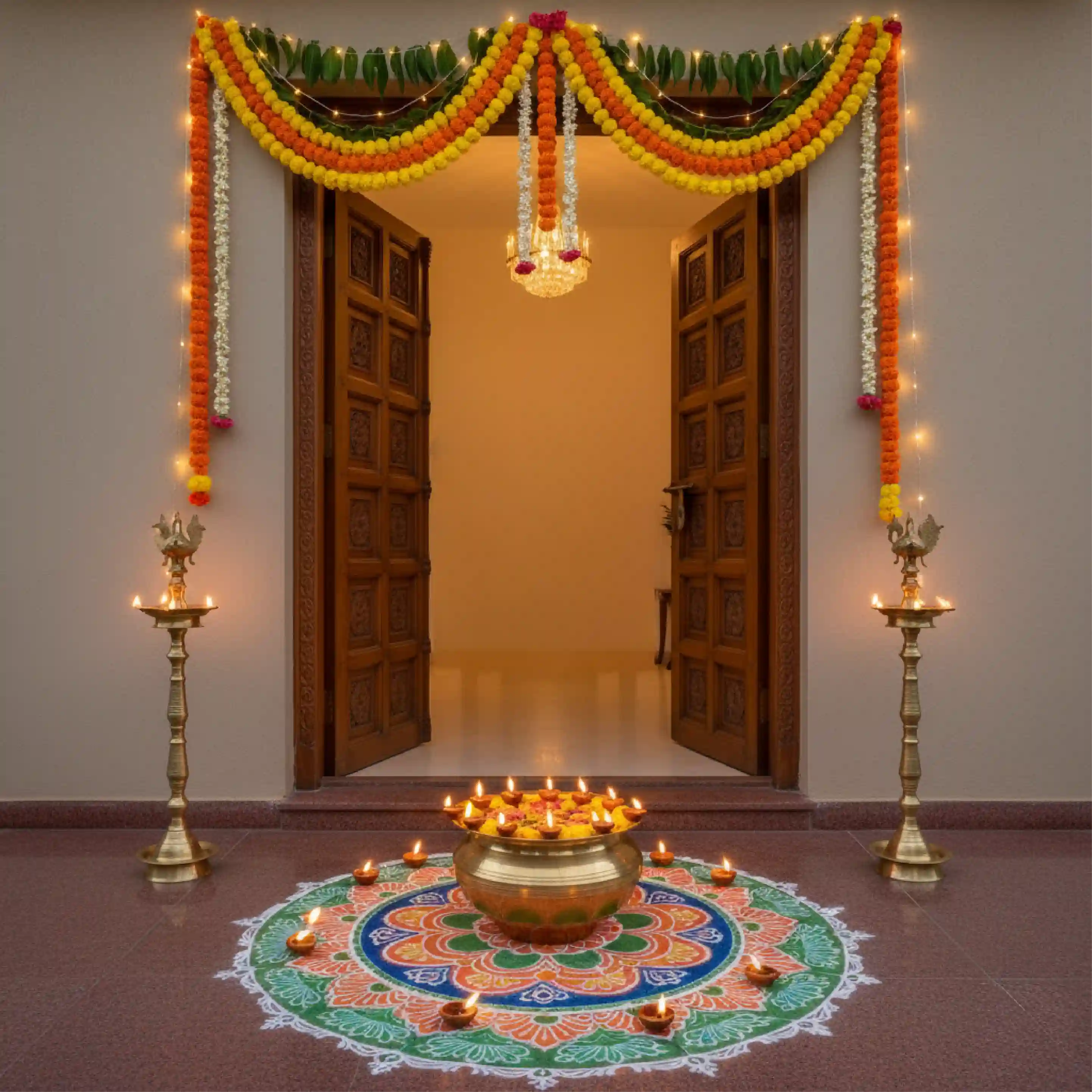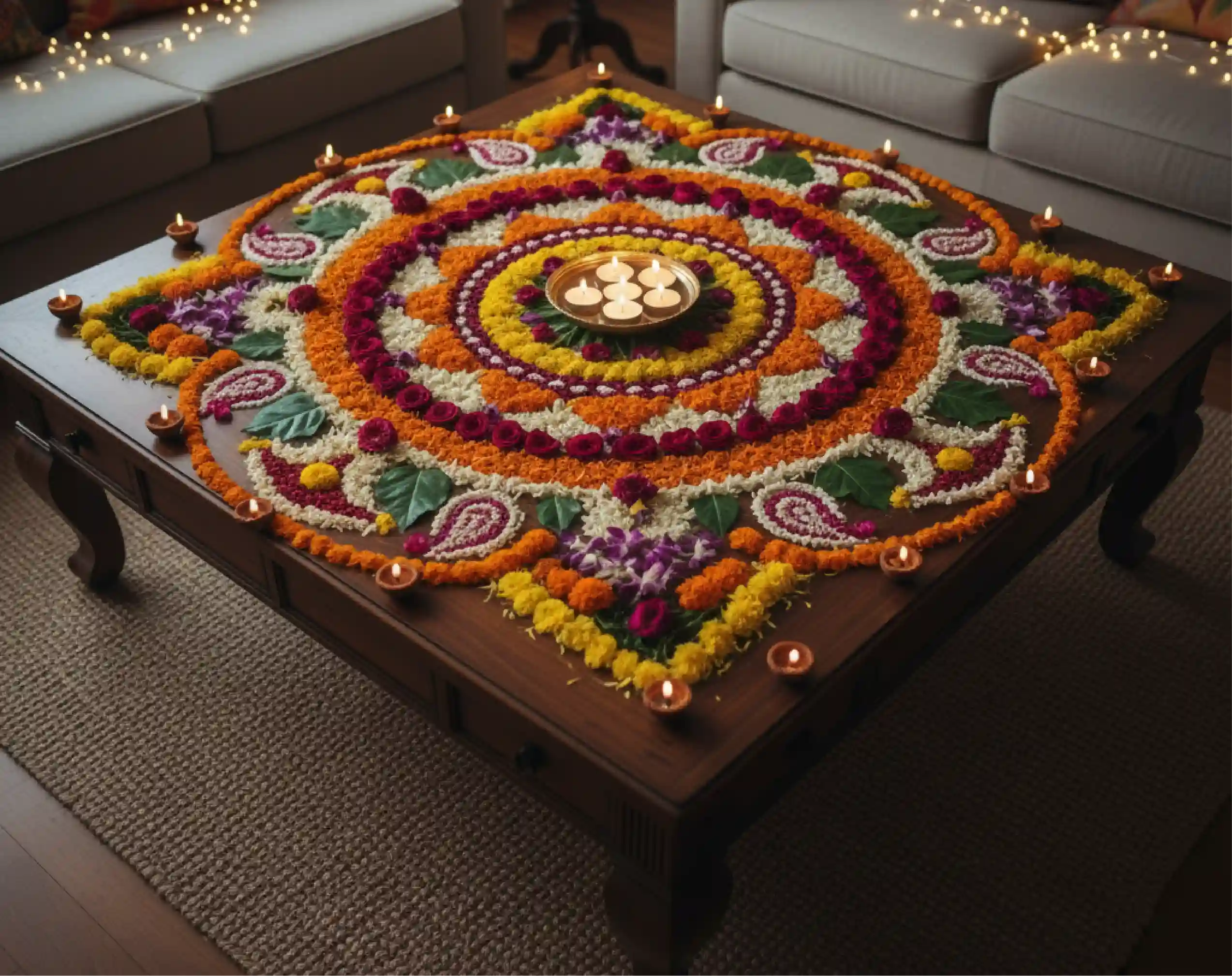 If you’re short on space, think smart: a framed rangoli mat, a floral mandala on a coffee table, or a pattern traced out on a step can carry the same spirit. It’s less about scale and more about intention.