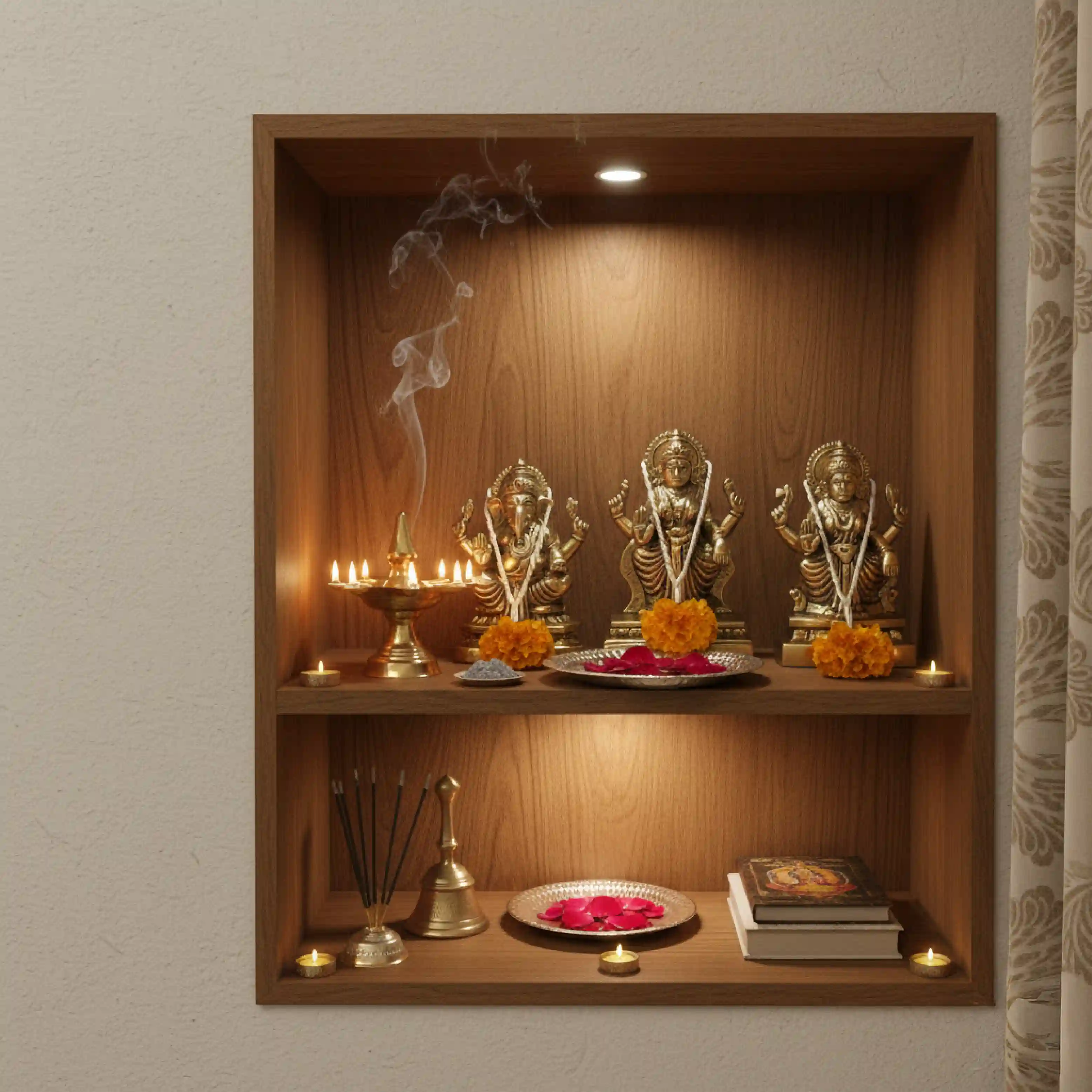 You don’t need a separate room to create it. A niche shelf with idols, diyas, fresh flowers and incense can feel just as powerful. Add layered lighting - soft above, warm below - and suddenly, the smallest corner becomes the heart of your home.