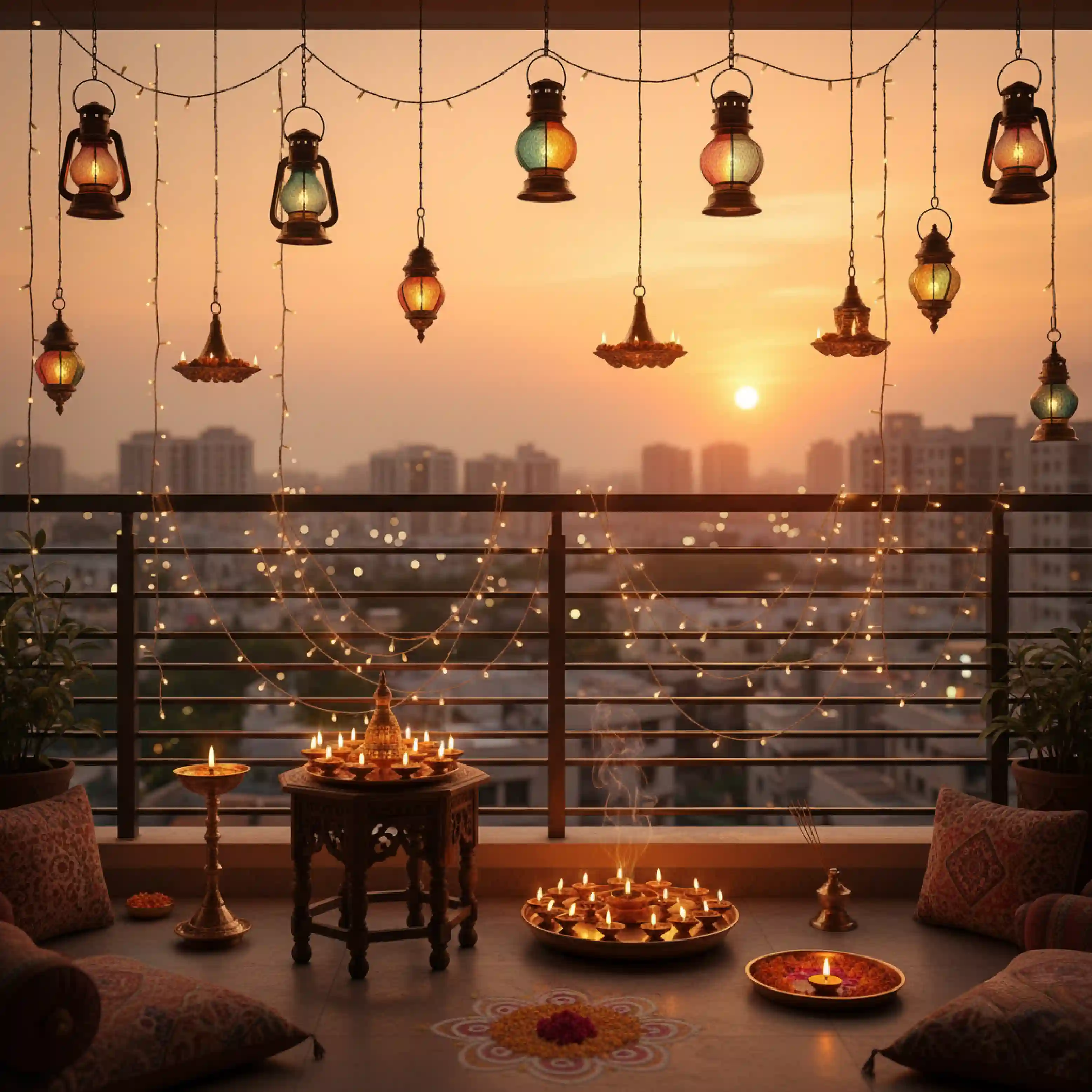 Many urban homes have compact layouts, but a balcony can become the most magical ritual zone of all. Twilight pujas with hanging lanterns, diya trays on a small side table, and strings of fairy lights can turn this spot into your festival’s golden hour.
