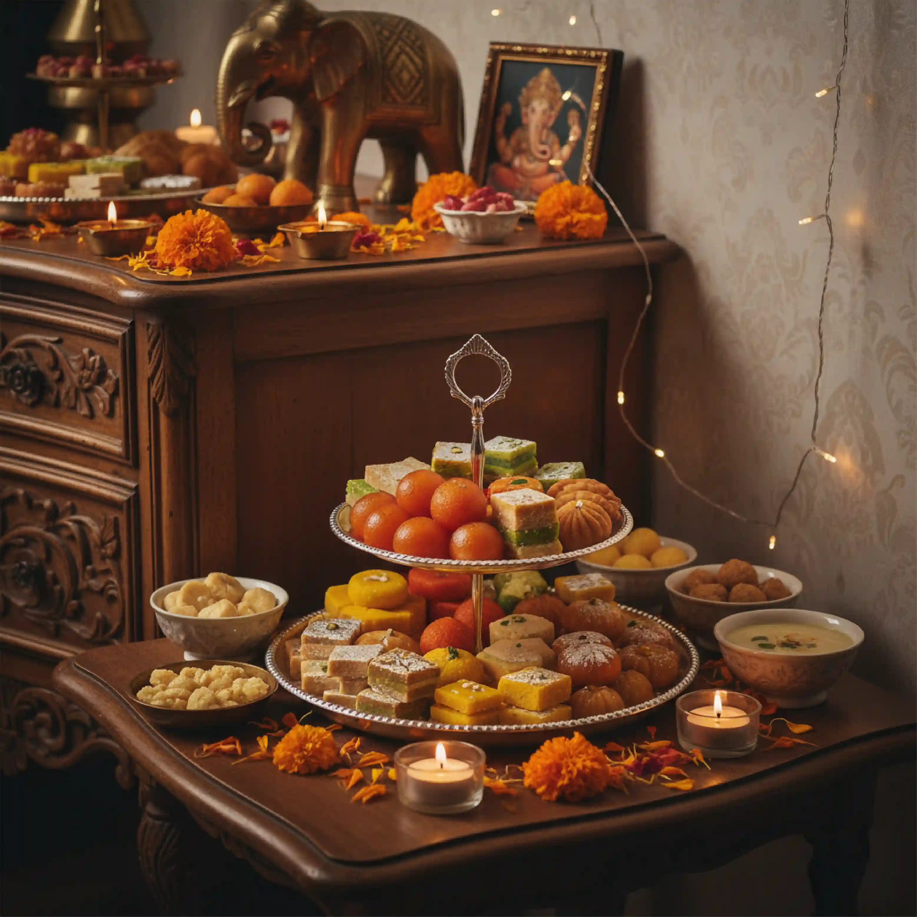 Design a mini dessert station or a mithai platter corner. Think of it like a festive altar to food. It makes the tradition tangible, accessible and undeniably beautiful.
