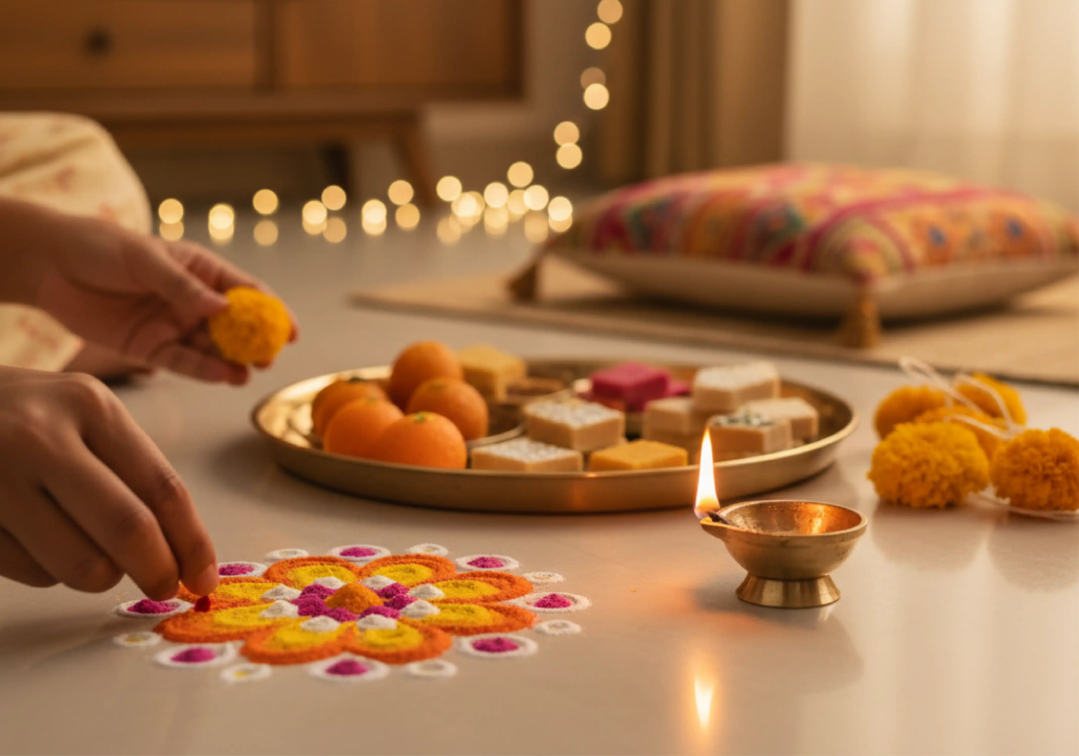 The diya corner. The rangoli space. The sweet station. The twilight balcony. These are not just decor moments. They’re living rituals, ready to be passed on.