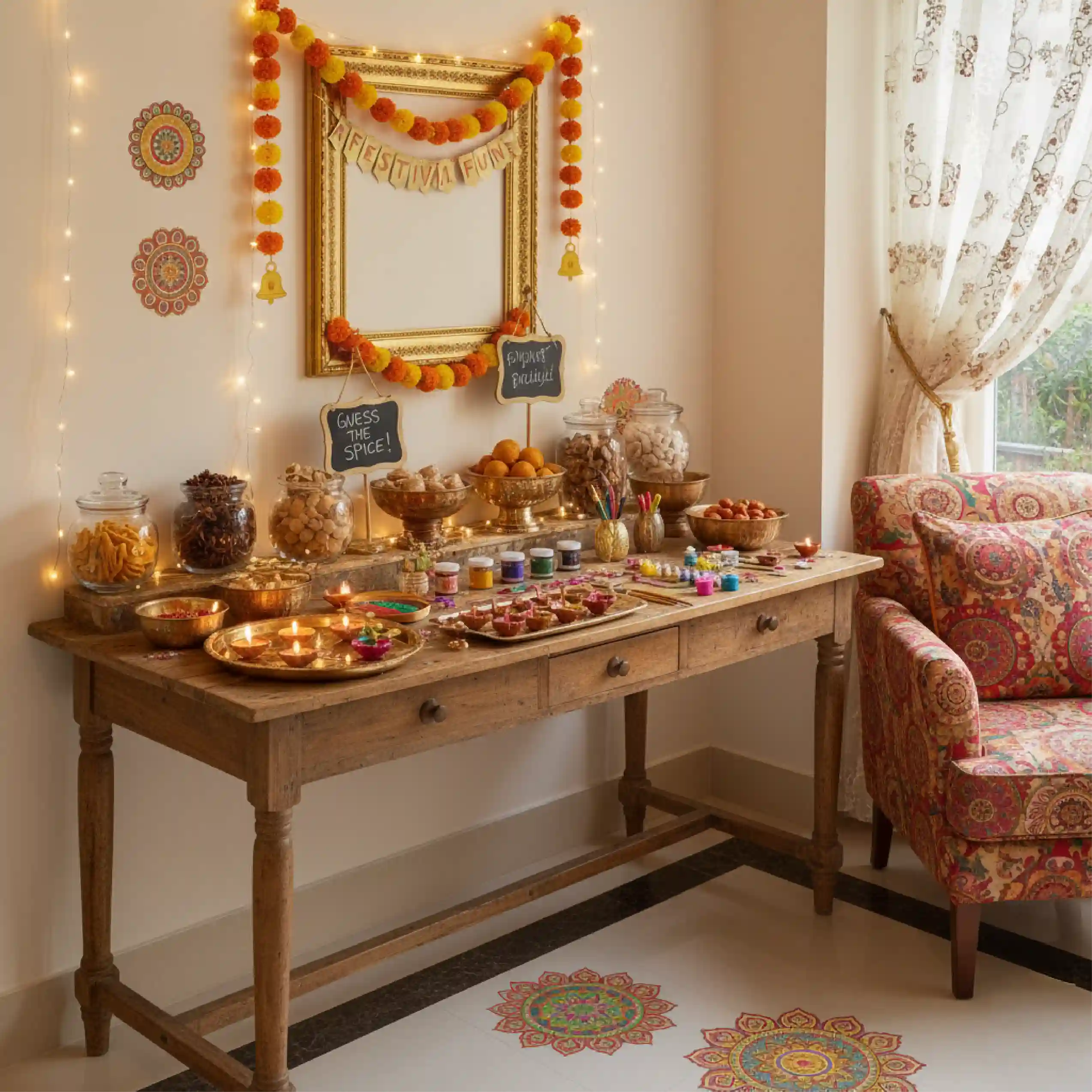 Make your home feel like a festival playground. Dedicate a corner for selfies or candid moments. A small sweets-and-spice station encourages exploration and interaction. Even a simple “guess the spice” game or DIY diya decoration table for kids can make your space feel lively and playful. It’s these little experiences that make your home memorable, not just decorative.