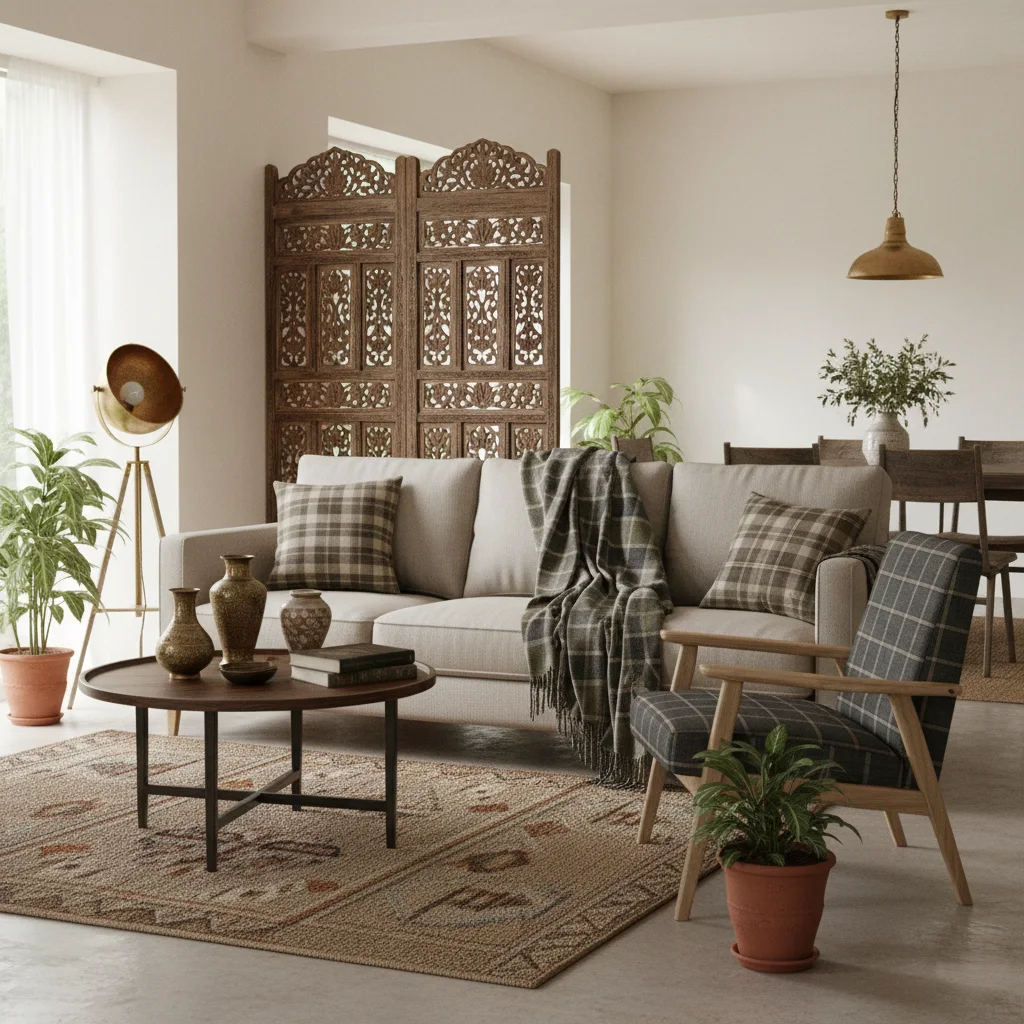 This year also saw the charming comeback of modern tartan patterns, a global classic reinterpreted for Indian homes. Instead of traditional bold checks, designers introduced softer, contemporary tartan palettes — olive greens, muted charcoals, rustic browns, and elegant neutrals. Tartan found its way into upholstery, throws, statement cushions, and accent details, adding warmth and character without overwhelming the space. This refined tartan revival blended beautifully with Indian aesthetics, offering global appeal with homely comfort